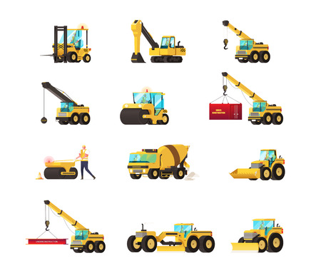 建設機械 重い道路機器トラック フォークリフト トラクター 掘削クレーントラックイラストセット 機器輸送工事 産業用クレーン プレミアムベクター